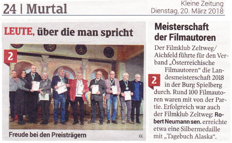 Der Filmklub Zeltweg/Aichfeld führte für den Verband "Österreichische Filmautoren" die Landesmeisterschaft 2018 durch.